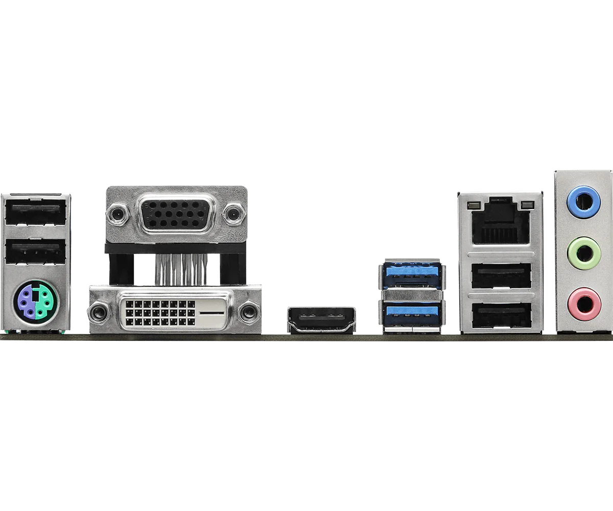 | Rear Panel I/O | 1 x PS/2 Port, 1 x D-Sub, 1 x DVI-D, 1 x HDMI, 4 x USB 2.0, 2 x USB 3.2 Gen1, 1 x RJ-45, HD Audio Jacks |